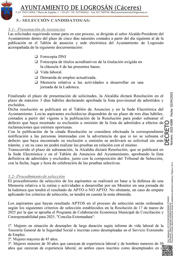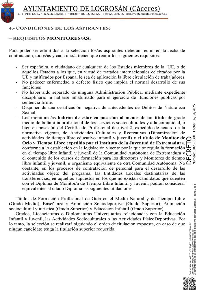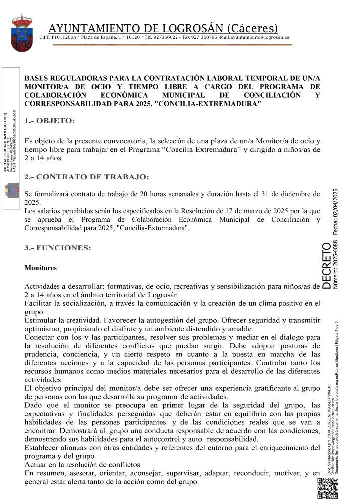 OFERTA DE EMPLEO. MONITOR/A DE OCIO Y TIEMPO LIBRE 03 abril 2025 Documentos 20250401_Resolución_DECRETO 2025-0088 [BASES MONITOR].pdf (pdf 424,6 kB)