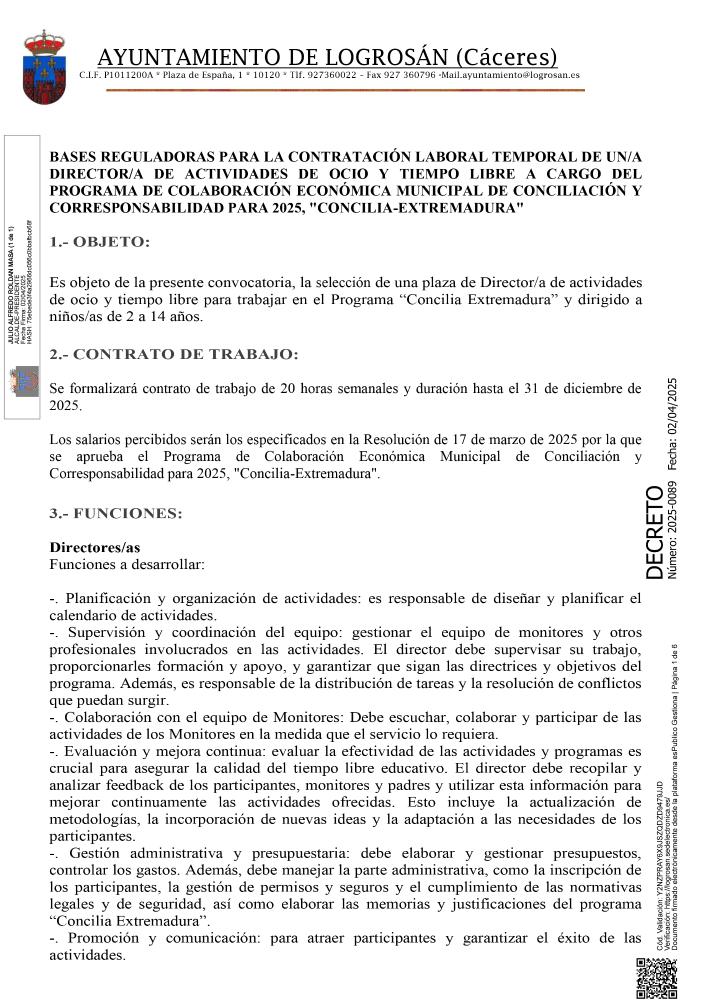 OFERTA DE EMPLEO. DIRECTOR/A DE OCIO Y TIEMPO LIBRE 03 abril 2025 Documentos 20250402_Resolución_DECRETO 2025-0089 [BASES DIRECTOR].pdf (pdf 434,6 kB)