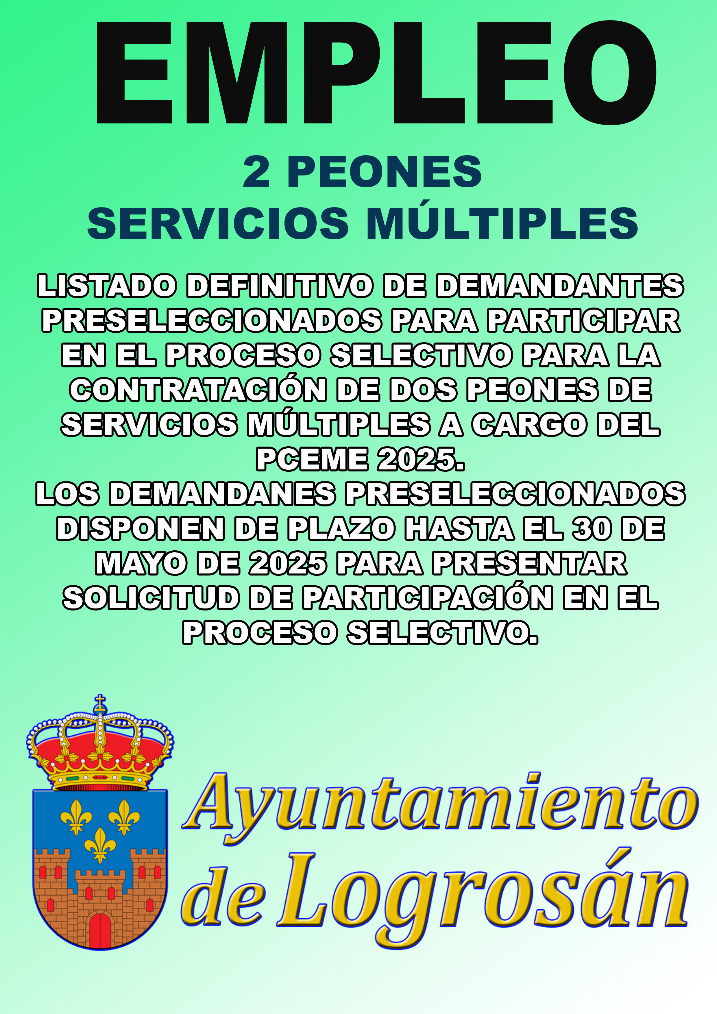 LISTADO DEFINITIVO DE DEMANDANTES PRESELECCIONADOS PARA PARTICIPAR EN EL PROCESO SELECTIVO PARA LA CONTRATACIÓN DE DOS PEONES DE SERVICIOS MÚLTIPLES A CARGO DEL PCEME 2025. LOS DEMANDANES PRESELECCIONADOS DISPONEN DE PLAZO HASTA EL 30 DE MAYO DE 2025 PARA PRESENTAR SOLICITUD DE PARTICIPACIÓN EN EL PROCESO SELECTIVO.