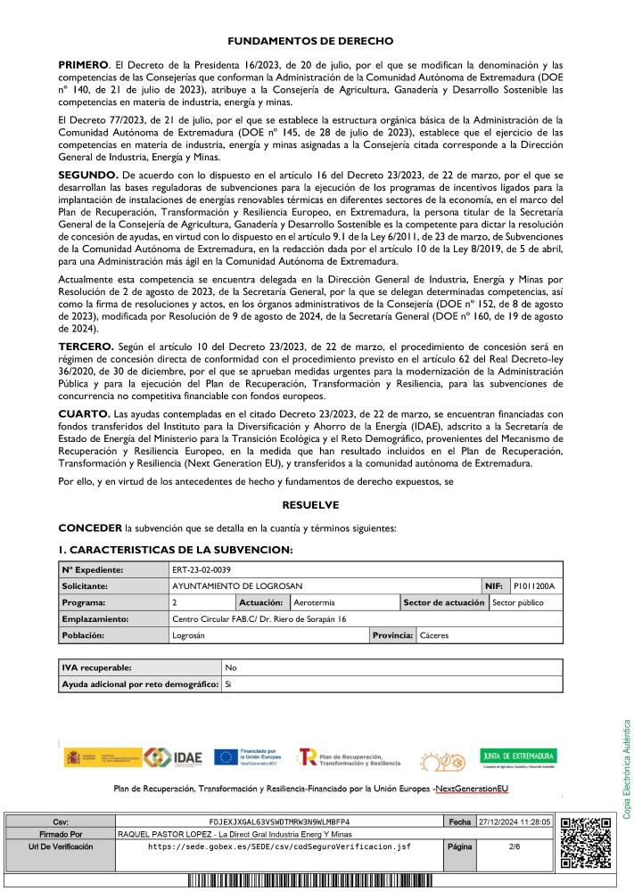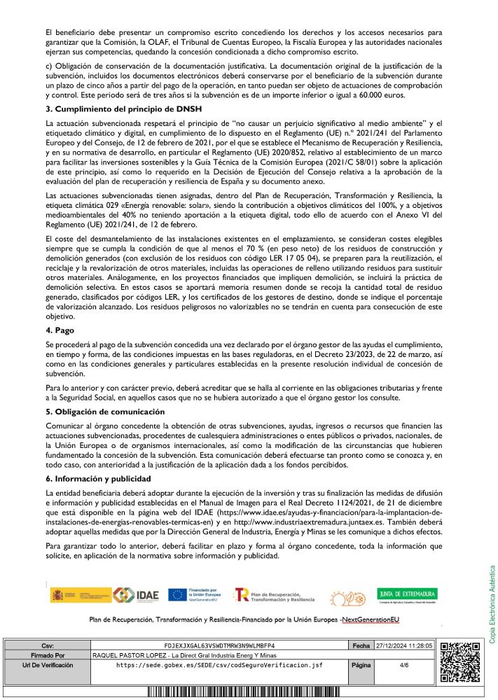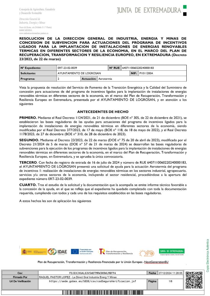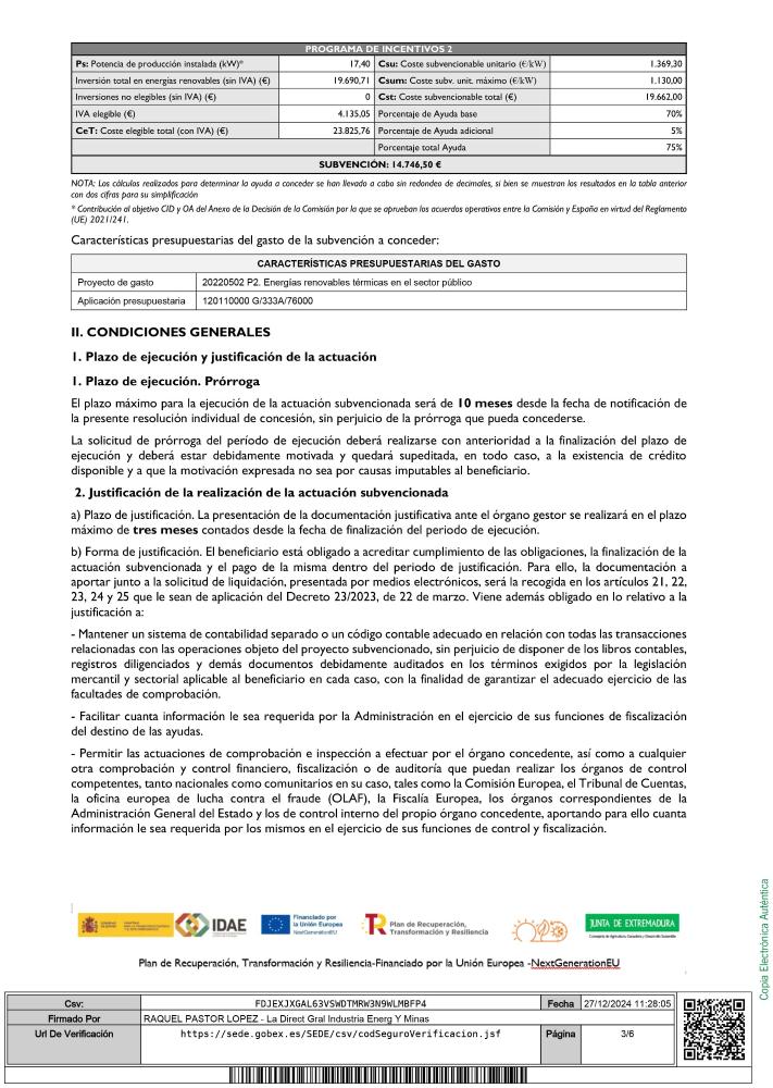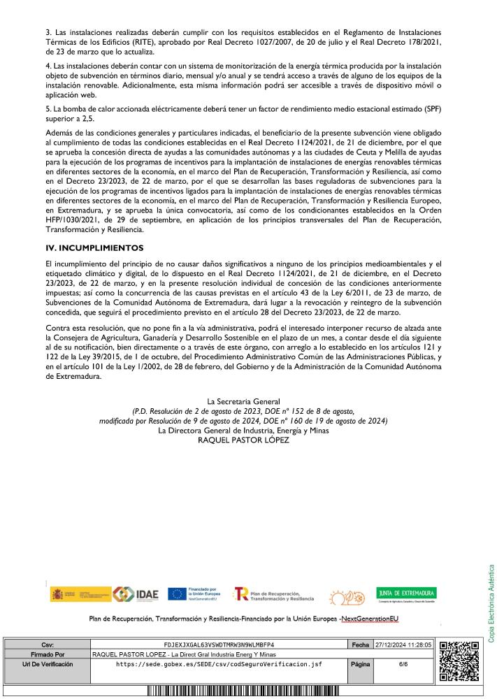 RESOLUCION DE LA DIRECCION GENERAL DE INDUSTRIA, ENERGIA Y MINAS DE CONCESION DE SUBVENCION PARA ACTUACIONES DEL PROGRAMA DE INCENTIVOS LIGADOS PARA LA IMPLANTACION DE INSTALACIONES DE ENERGIAS RENOVABLES TERMICAS EN DIFERENTES SECTORES DE LA ECONOMIA, EN EL MARCO DEL PLAN DE RECUPERACION, TRANSFORMACION Y RESILIENCIA EUROPEO, EN EXTREMADURA (Decreto 23/2023, de 22 de marzo)