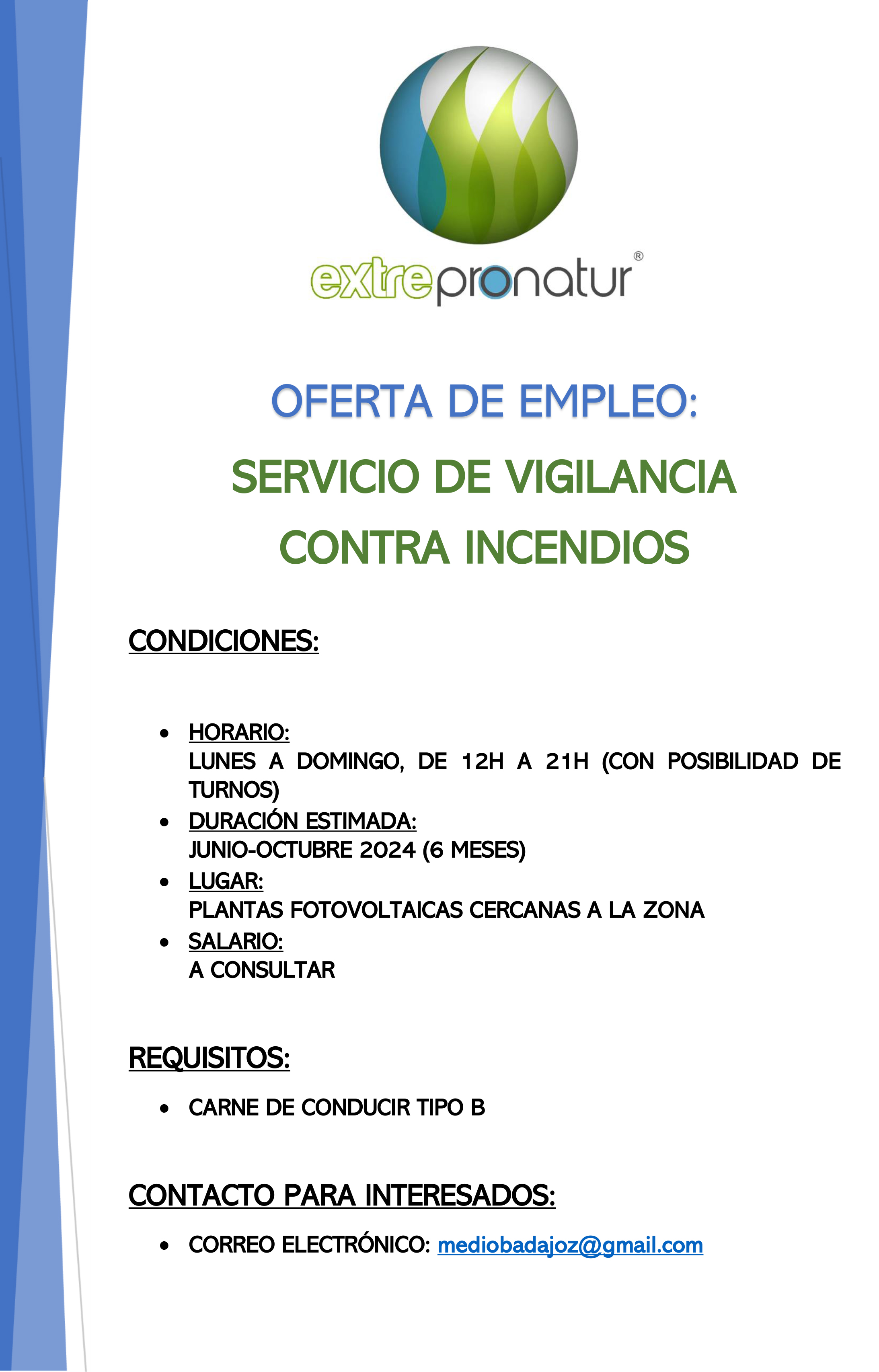 OFERTA DE EMPLEO. Servicio de vigilancia contra incendios en planta fotovoltaica de Logrosán Documentos OFERTA DE EMPLEO.pdf (pdf 145,7 kB)